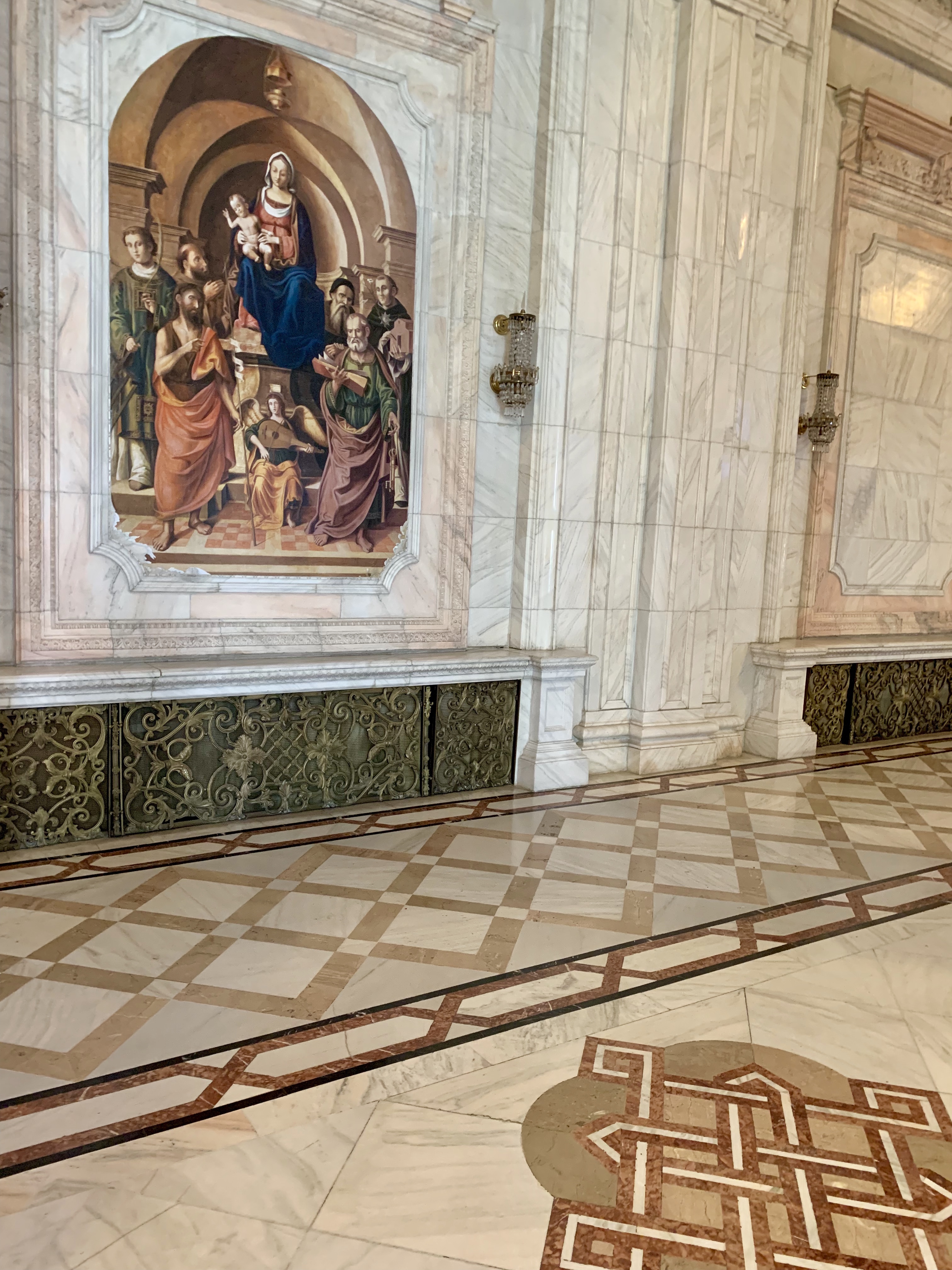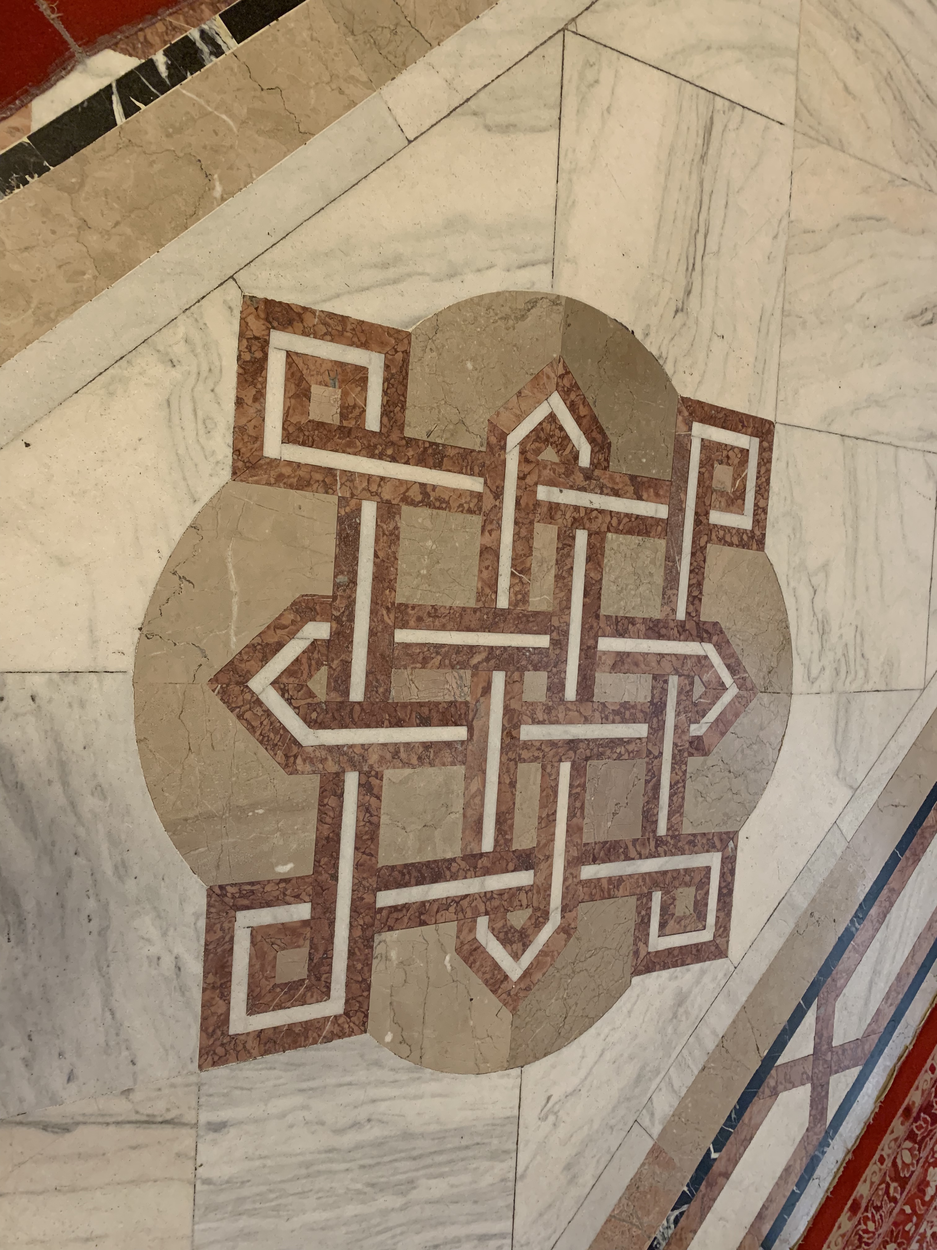 Pe jos, din loc in loc, este redata in marmura “amprenta” clădirii, adică un fel de diagrama a ce corpuri de clădiri contine ea.