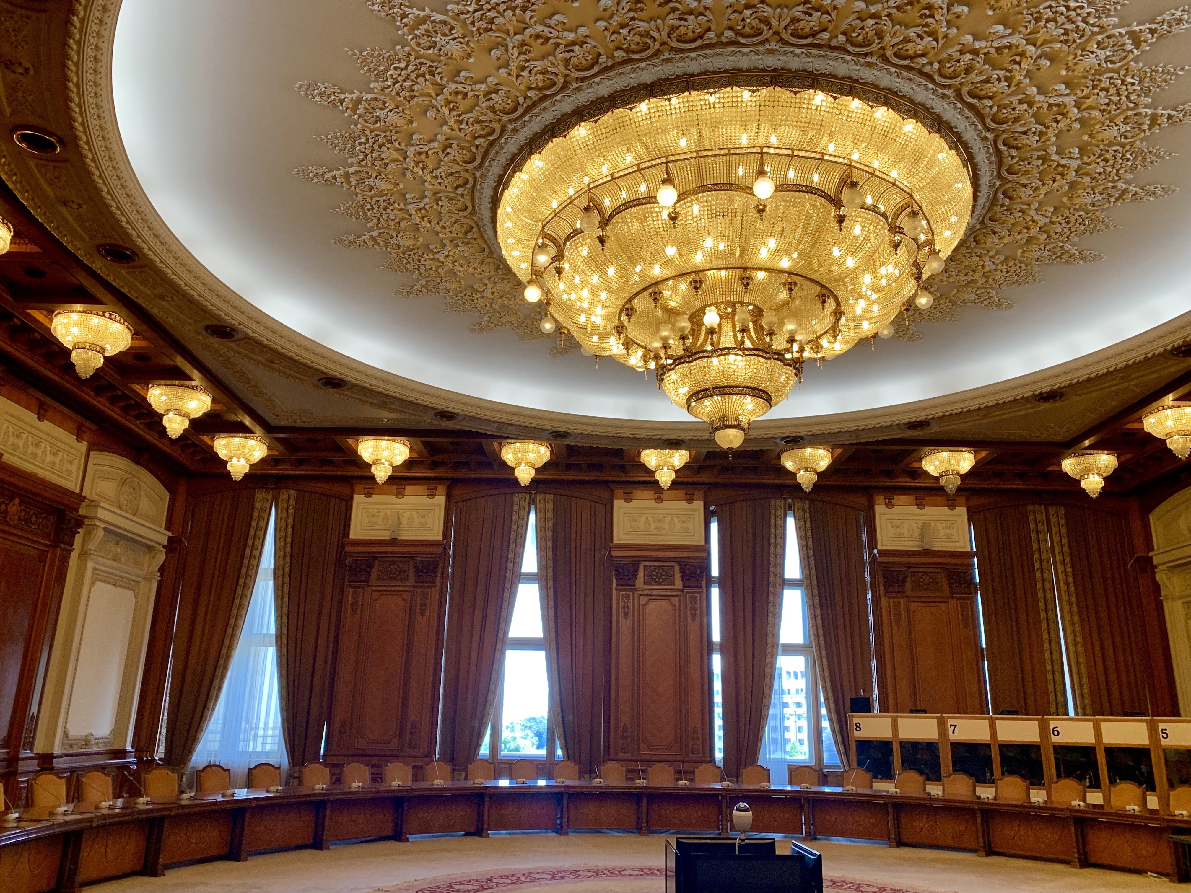 Termenul a fost prelungit apoi pana in 1990, insa nici in prezent nu este finalizata. Numai 400 de incaperi si 2 sali de sedinte sunt finisate si folosite, dintr-un total de 1.100 de camere. Noi am văzut numai câteva; ghidul ne-a spus ca aproape 5% am văzut din ce este acolo. Nici măcar 5%… Aproape.