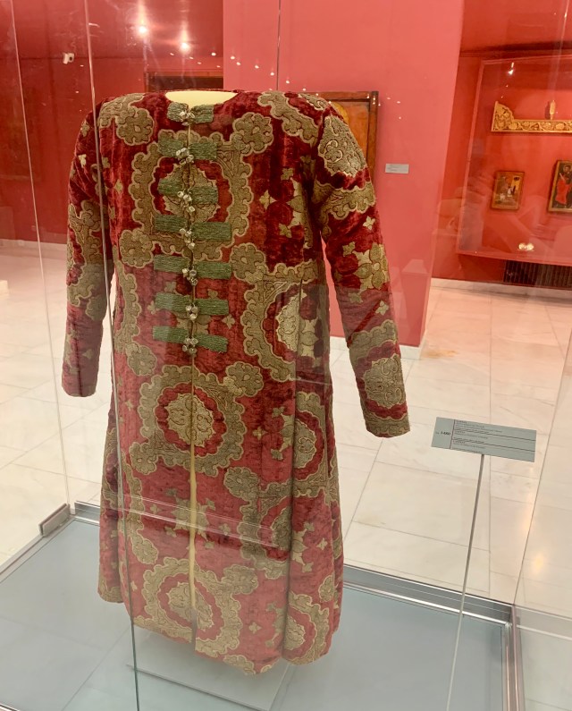 Câteva caftane și veșminte preoțești din aceeași perioada. Ca fapt divers, derivat din vechiul costum persan de călărie, caftanul era iniţial purtat de demnitarii bizantini, fiind preluat ulterior de dregătorii de rang înalt din administraţia otomană, inclusiv de cei de la curtea voievozilor din Țările Române.