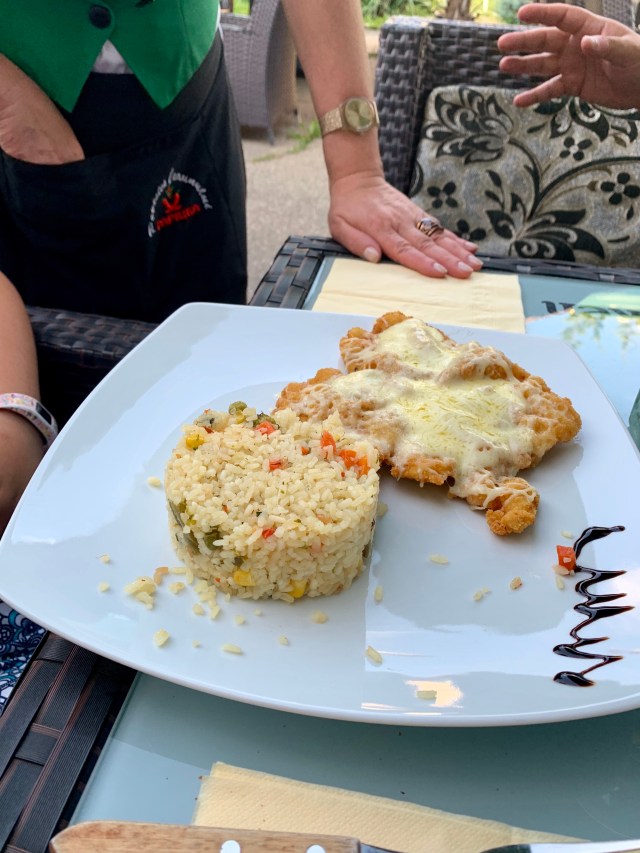 Anna a vrut un șnițel cu cașcaval și orez cu legume.