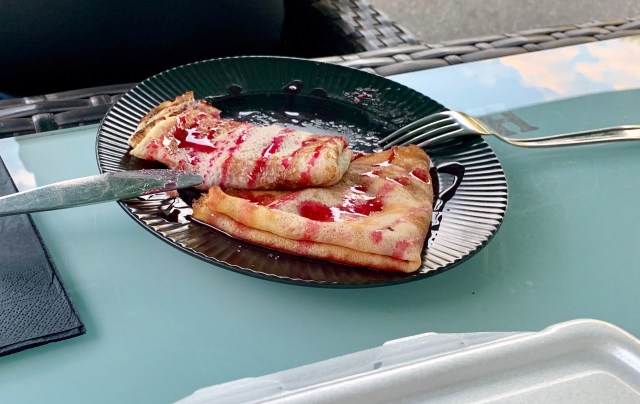 A terminat-o in mai puțin de 5 minute. La fel s-a întâmplat și cu clătitele lui cu dulceața. Au dispărut din 3 înghițituri.