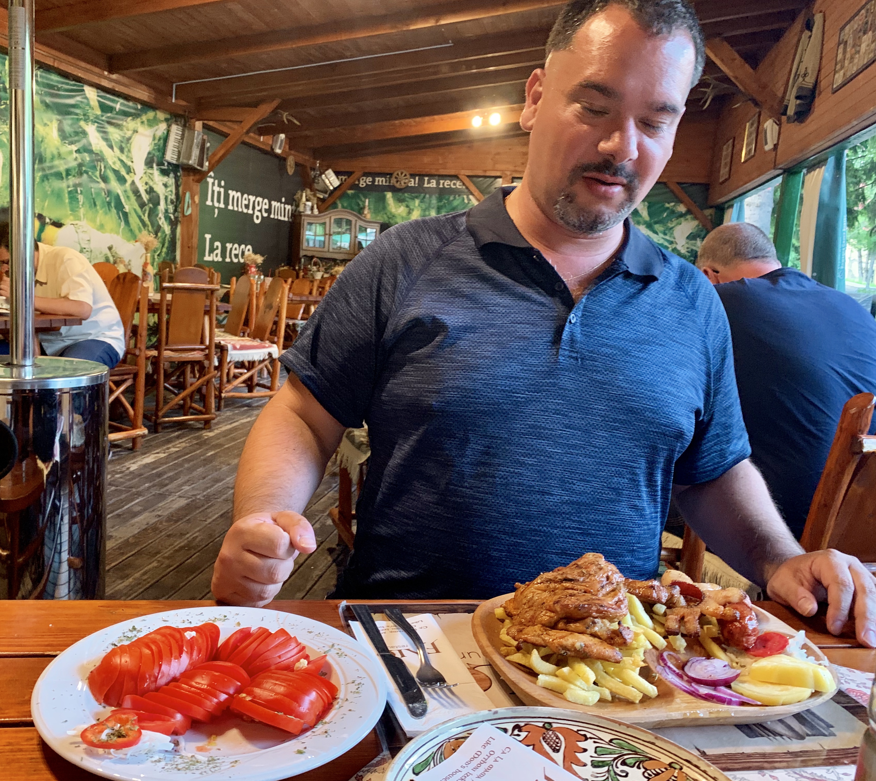Iar George a vrut o salata mare de roșii și brânza, și un platou specific unguresc cu de toate: cârnați, șunca afumata, carne de porc prăjită și carne de vita. Pe principiul ca, in caz ca nu e mulțumit cu una, o poate încerca pe a doua… In poza cred ca se închina la câta mâncare i s-a pus in fata.