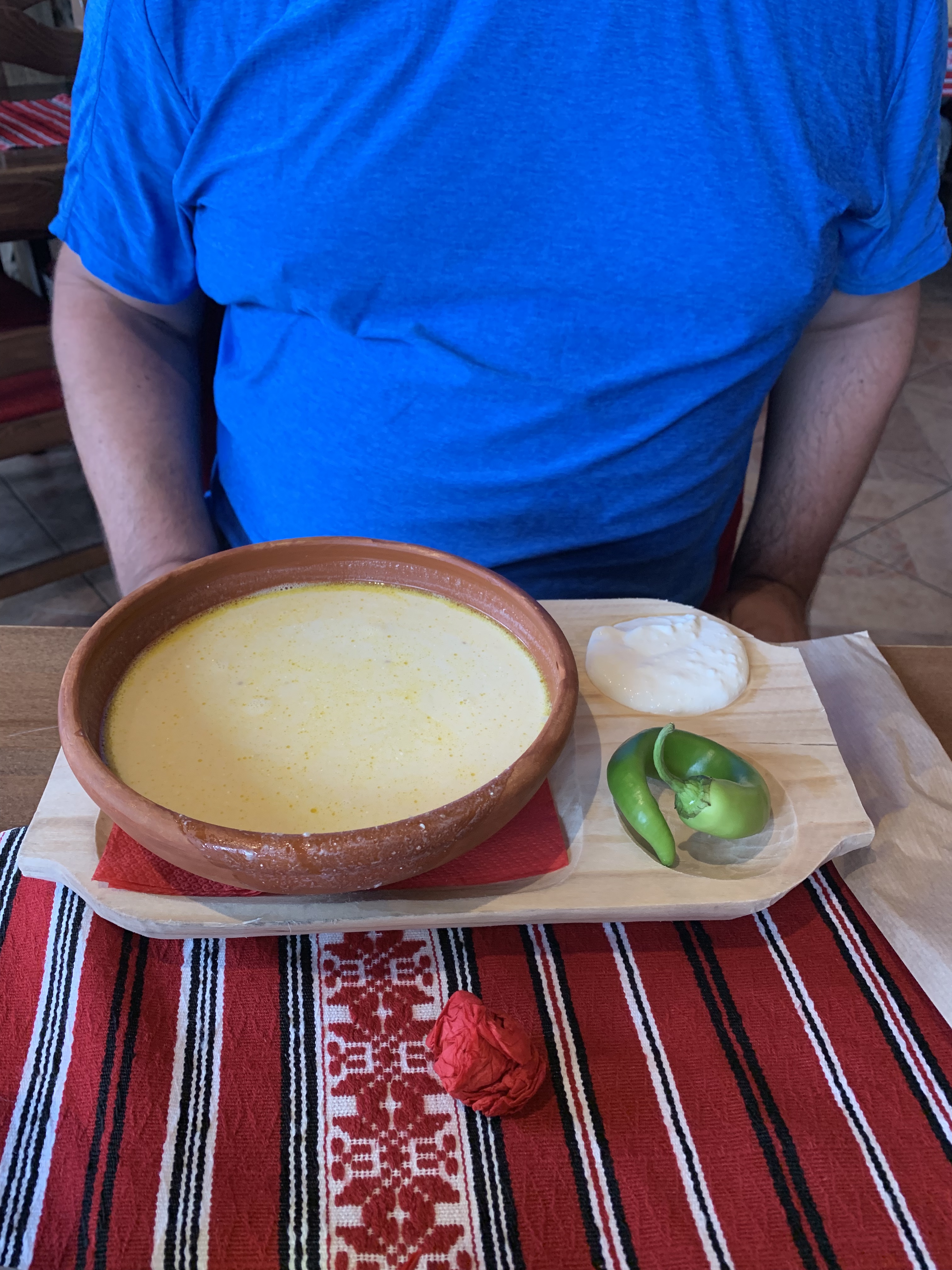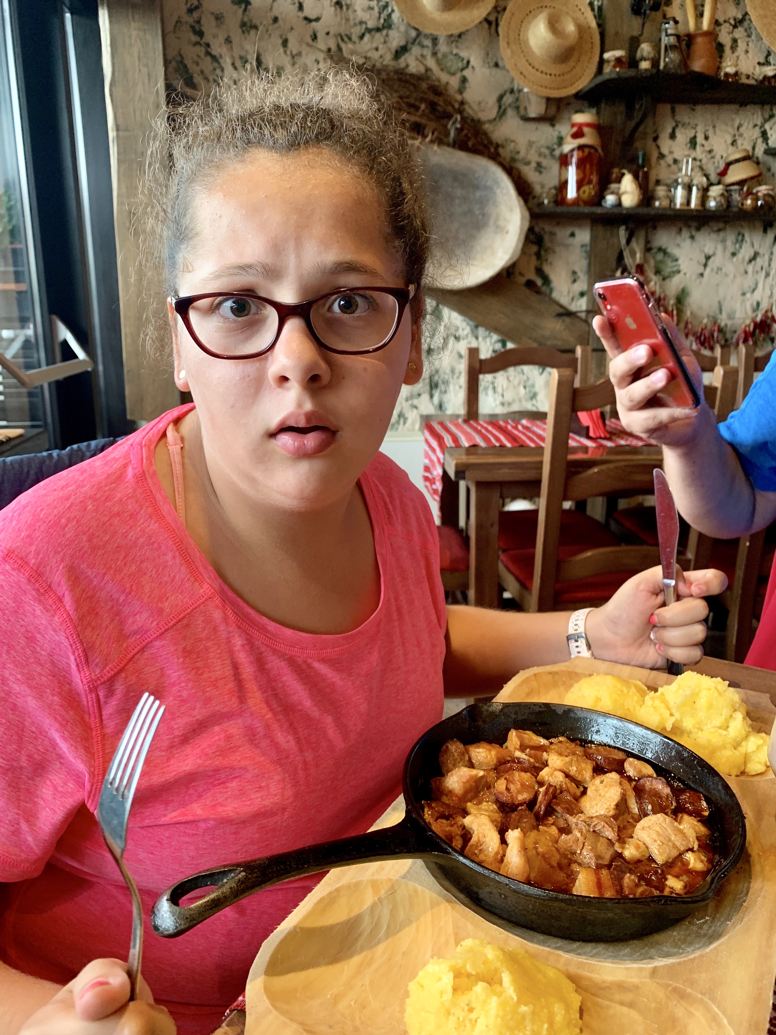 Și colegul de la masa de alături, cu un munte de cartofi prăjiți și coaste de porc. După ce tocmai servise o ciorba de burta, evident.