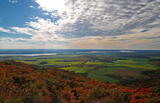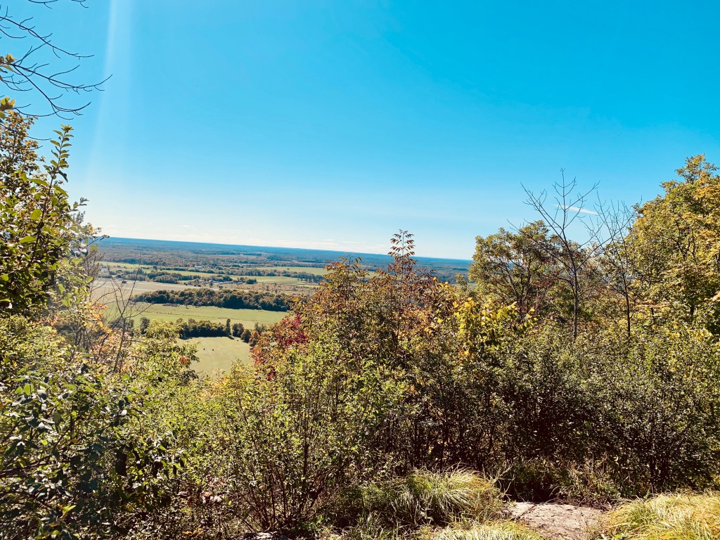 După vreo 20 minute de urcat pe coclauri am ajuns la o belvedere care se cheamă Lauriault. Cu banca. De unde se poate admira o parte a povârnișului Eardley. Acesta reprezinta frontiera dintre scutul canadian, care acoperă mai mult de jumătate din Canada, și câmpiile fluviului Saint Laurent. Se ridică la 270 de metri deasupra Văii Ottawa și se întinde pe mai mult de 30 de kilometri.