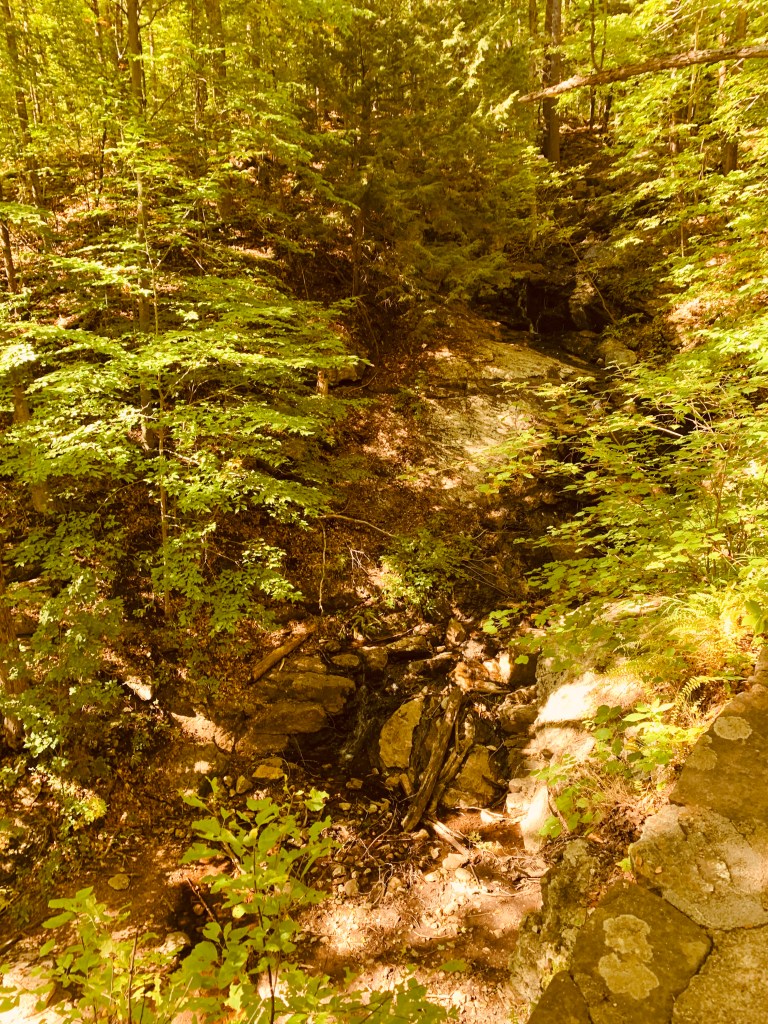 La vreo 1,5 km de la locul de parcare am dat de cascada Lauriault. Nu e cine știe ce acum, in perioada asta a anului, pentru ca nu a plouat destul, iar volumul apei este foarte mic. Ca sa nu zic aproape inexistent. Se pare însă ca primăvara, când se topește zăpada, este chiar o priveliște interesantă cascada asta. Bine, cred ca și drumul prin pădure atunci necesita niște cizme ca lumea sa poți înainta prin noroaiele respective…
