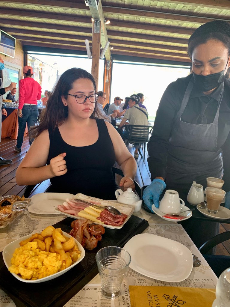 George a inclus in acest prim bilet la Vatican și micul dejun (cu Papa! 🤪 Noroc ca nu ne-am intersectat cu el acum, fiind in vizita oficială in Canada). La sfârșitul vizitei, ghidul ne-a indicat pe unde sa o luam sa ajungem la sala exterioara unde am mâncat, destul de înfometați, un mic dejun american.