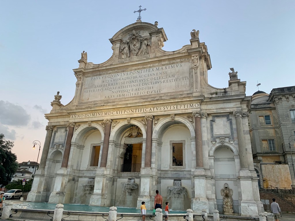 Am urcat pieptiș mai mult de 1 km, plus vreo 100 de trepte sa ajungem la ea. A fost construita în stil baroc în 1612 de Papa Paul al V-lea Borghese pentru a restaura un apeduct antic din vremea lui Traian.