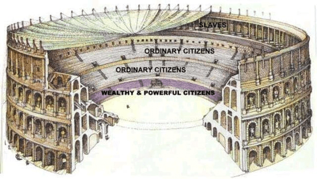 Pentru o locație care putea găzdui până la 50.000 de spectatori, dispunerea locurilor la Colosseum era organizată cu precizie. Împăratul avea o intrare proprie și o lojă imperială pentru el și anturajul său. Alături, într-o secțiune cu balustrade, se aflau niște locuri destinate pentru alte categorii de reprezentanți ai autorităților, în timp ce restul lumii stătea pe trepte. De-a lungul acelor trepte, cei prezenți erau așezați în ordinea statutului în societate și a cetățeniei. Femeile și cei care nu erau cetățeni romani se așezau la un loc pe niște banchete din lemn, în timp ce sclavii stăteau în picioare pe o terasă (care acum nu mai există), situată deasupra acelor banchete. Ca să mențină ordinea, exteriorul Colosseumului era prevăzut cu numere gravate deasupra intrărilor, astfel încât oamenii știau unde să meargă pentru a-și găsi locul.