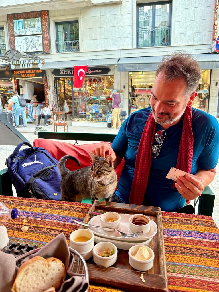 Așa că ne-am îmbrăcat rapid și am ieșit să luăm micul dejun… printre pisici de data asta. Istanbulul este plin de pisici și câini, iar localnicii se ocupă cu pasiune de ei și-i hrănesc și-i îngrijesc. Mai toți sunt maidanezi, dar peste tot au cutii cu mâncare și apă puse la dispoziție de oamenii din cartier.