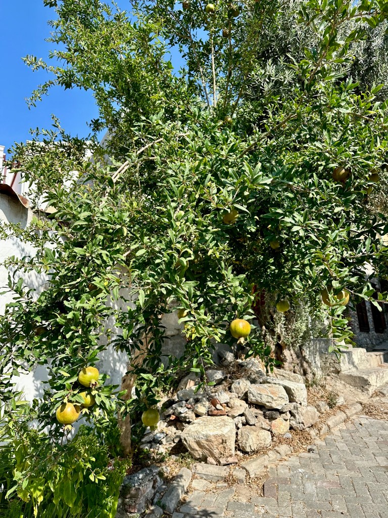 Înainte de a descrie aceste vestigii antice, vreau numai să spun că în această zonă am văzut o mulțime de pomi fructiferi care îmi lipsesc în America de Nord: caiși, piersici, vișini, cireși, duzi, portocali, lămâi, rodii, măslini și smochini. Sunt absolut fascinată și mereu mă opresc să fac o poză. Iar George se oprește să culeagă smochine, care sunt peste tot.😉