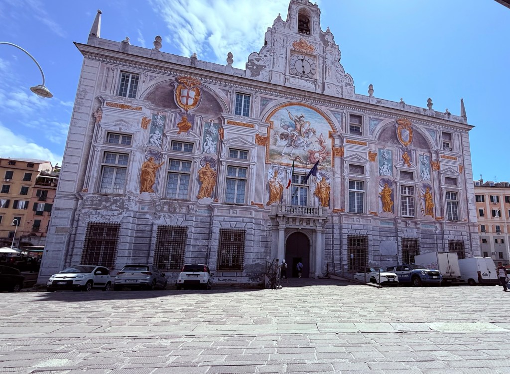 Next, we wandered over to Palazzo San Giorgio, a striking structure adorned with soft-hued frescoes and Renaissance charm, as if history itself had been painted in watercolor. Built in 1260 by Guglielmo Boccanegra (uncle of Genoa’s first Doge), the palace was originally intended to be a symbol of civil power, standing in contrast to the religious authority of the nearby Cathedral of San Lorenzo.