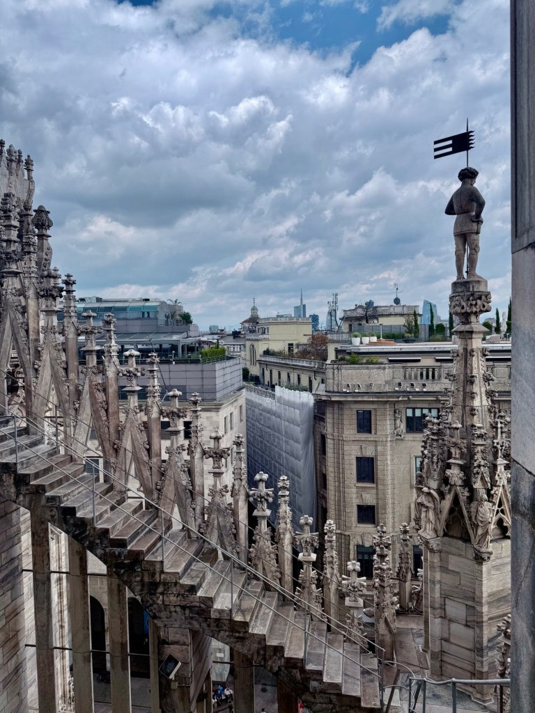 Finally, we climbed to the top (Anna and I by elevator, while George, naturally more spartan, took the stairs), and up on the rooftop, surrounded by dozens of Gothic spires rising like stone flames toward the sky, we came to a halt. Not for photos. Not for Instagram or Facebook. But because, for a few moments, we felt that rare kind of silence that makes you fall quiet without feeling awkward. From there, Milan looked like a living painting, and the Duomo—a cathedral not just of marble, but of time, of faith, and of dreams sculpted with patience. It’s incredible how much people can build when they’re in no hurry.