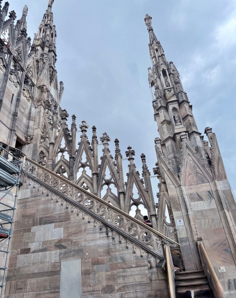 Arriving in front of the Milan Cathedral, we glanced at one another and sighed in unison: “Wow… how many steps are left to the top?” We breathed a collective sigh of relief when we realized our tickets included the elevator ride—I’m already tired of spiral-stair marathons, crowds, and extreme exercise without a breath of fresh air.